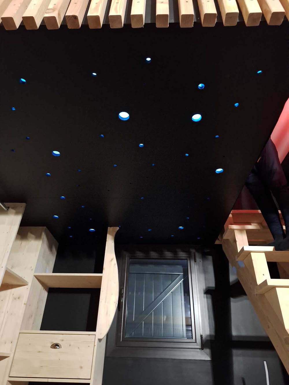 Création d'un lit en mezzanine avec ciel étoilée dressing sur mesure ainsi que bureaux encastrés dans l'escalier